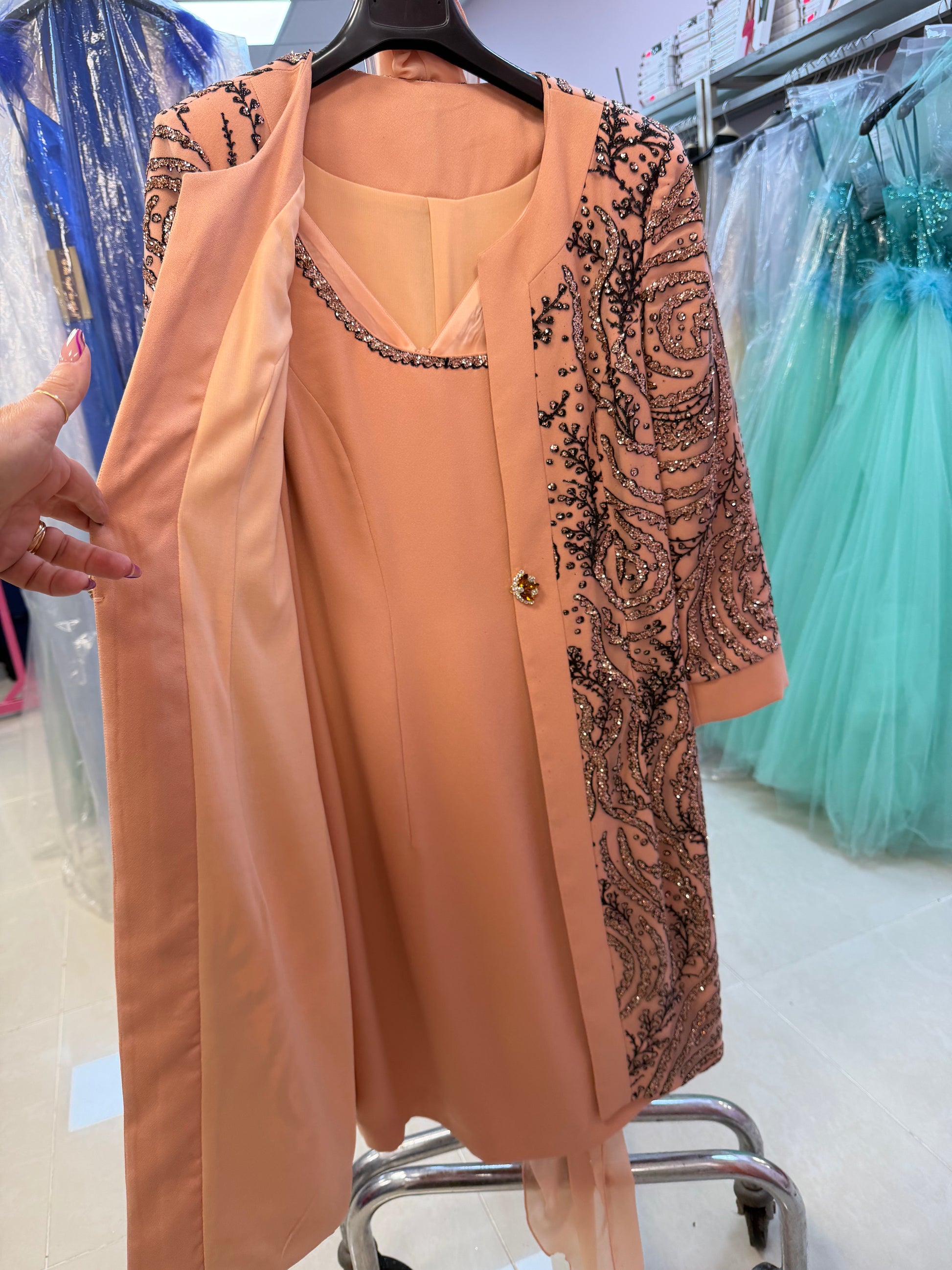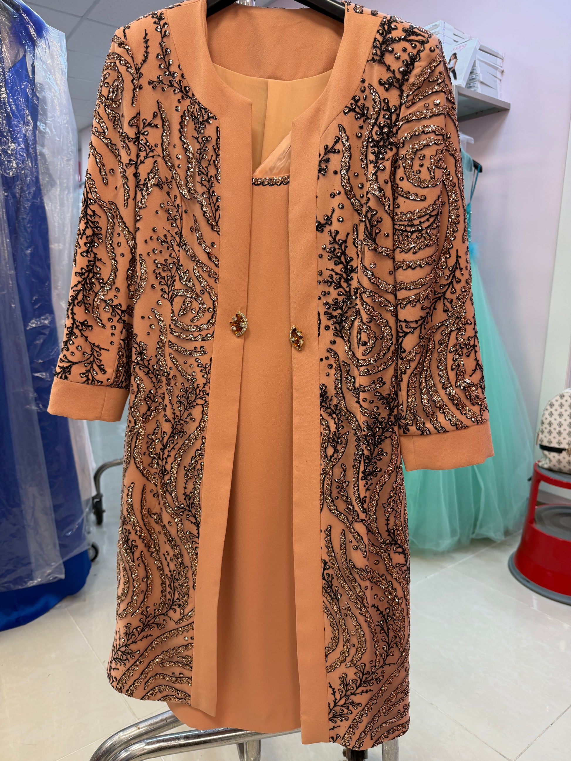 # Abito + Copriabito Diana Elegante completo composto da abito e copriabito coordinato, perfetto per occasioni formali e cerimonie. Il design sofisticato di Diana combina versatilità e raffinatezza, permettendoti di indossare i due capi insieme o separatamente per molteplici look. La qualità costruttiva garantisce comfort e durabilità nel tempo, mentre la silhouette curata valorizza la figura. Ideale per chi ricerca un investimento sartoriale che trascenda le tendenze stagionali.