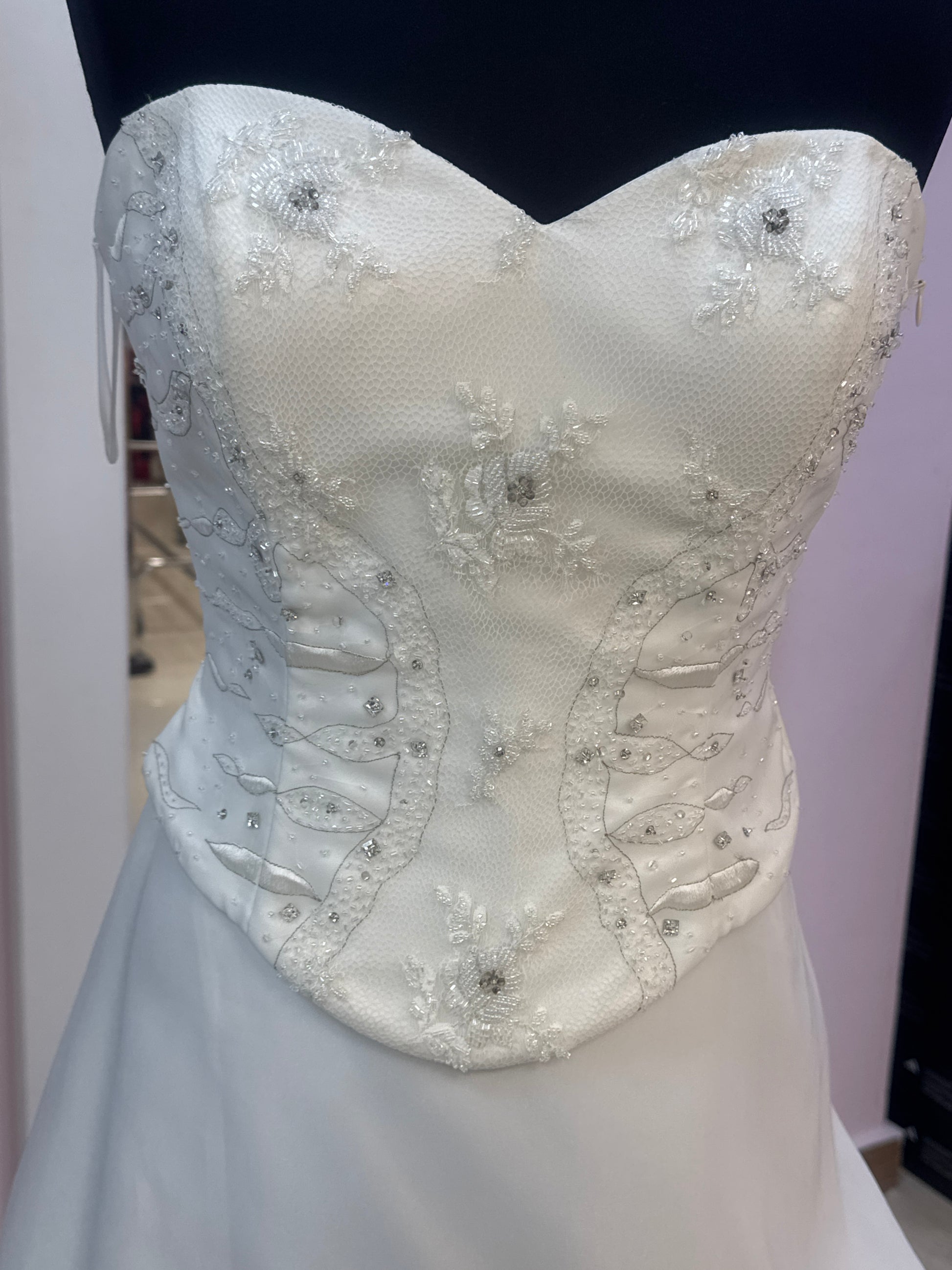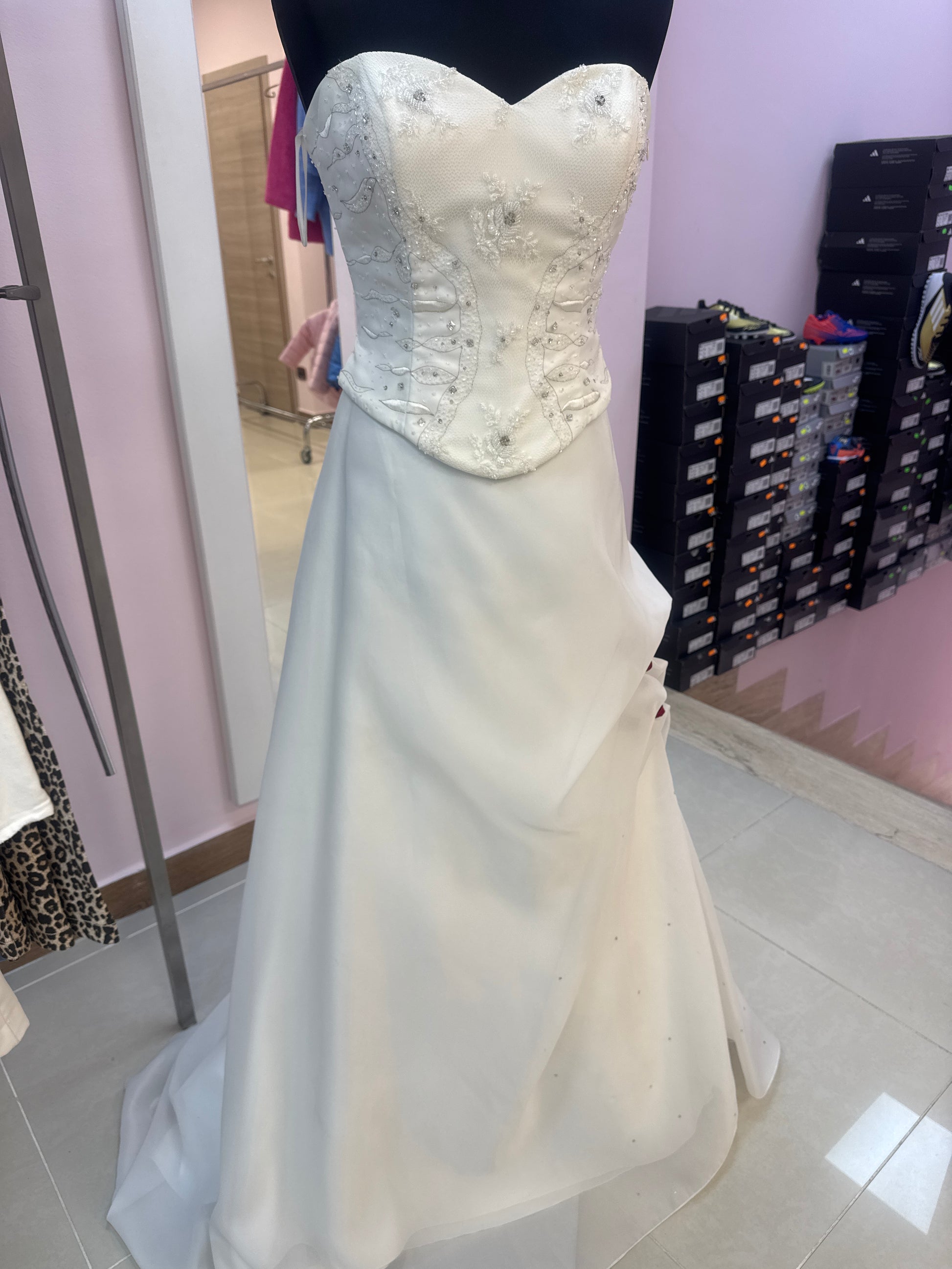 Abito Da Sposa gonnellone con roselline rosse in strass e corpetto bianco con ricami in argento
