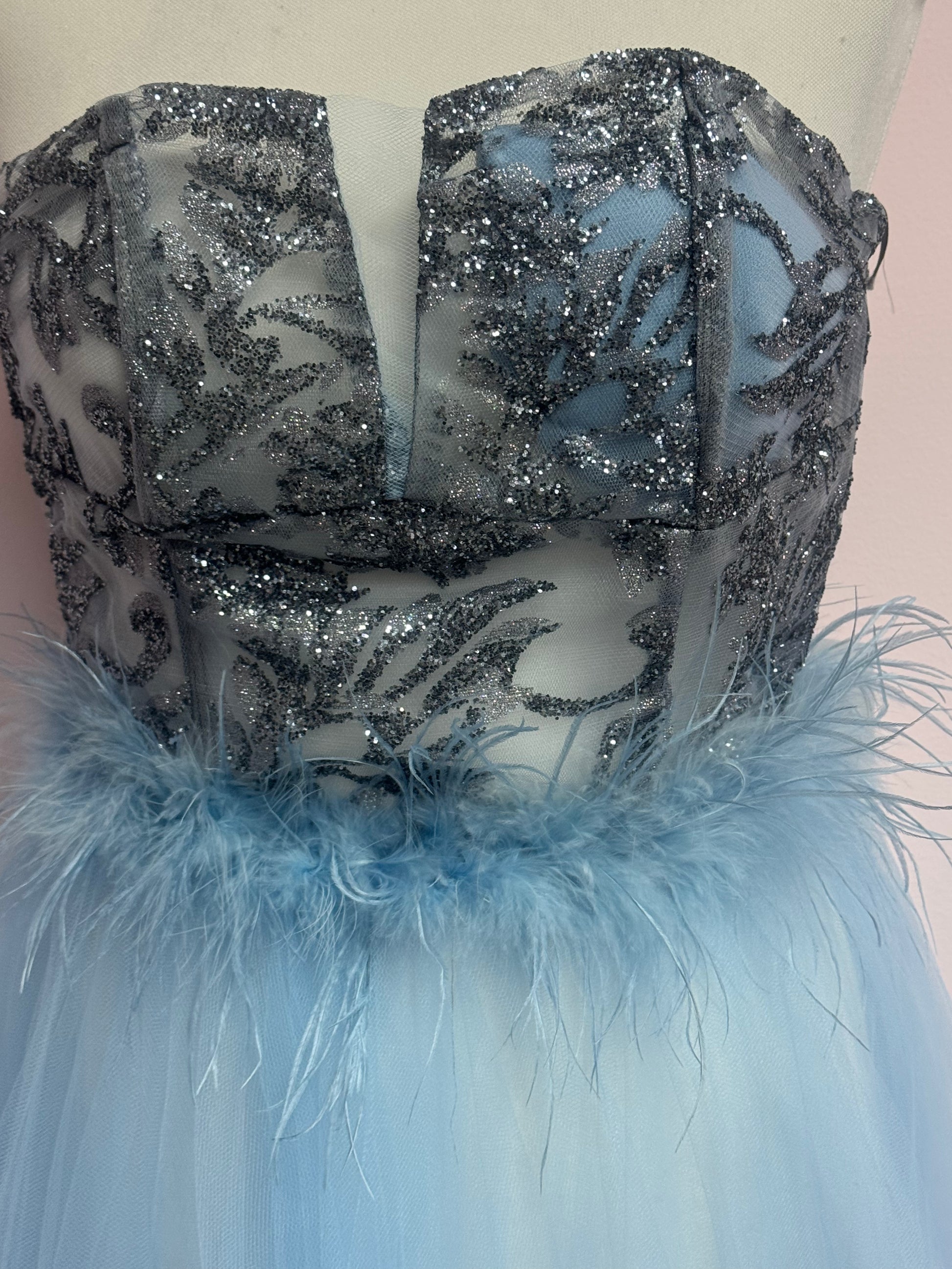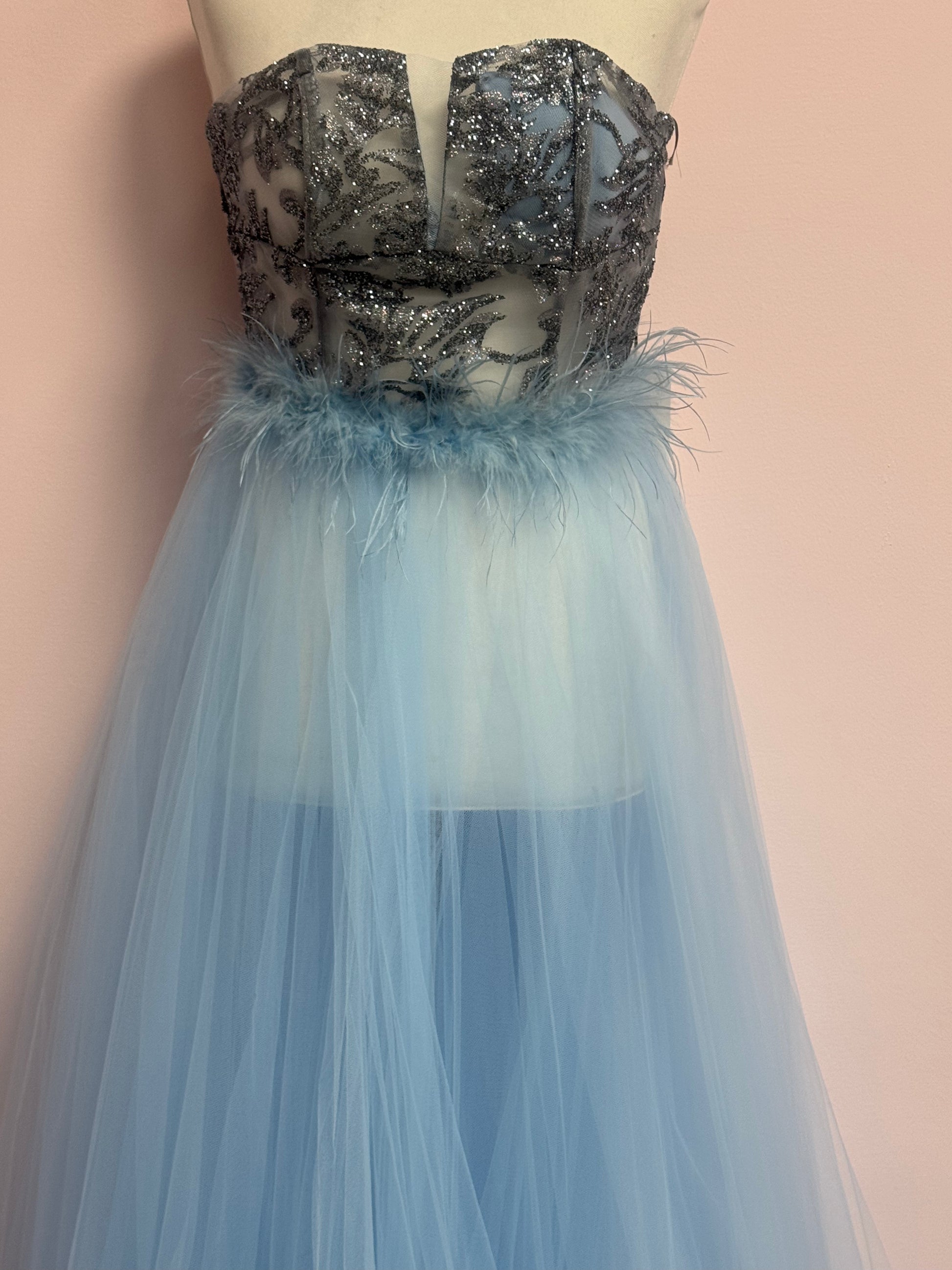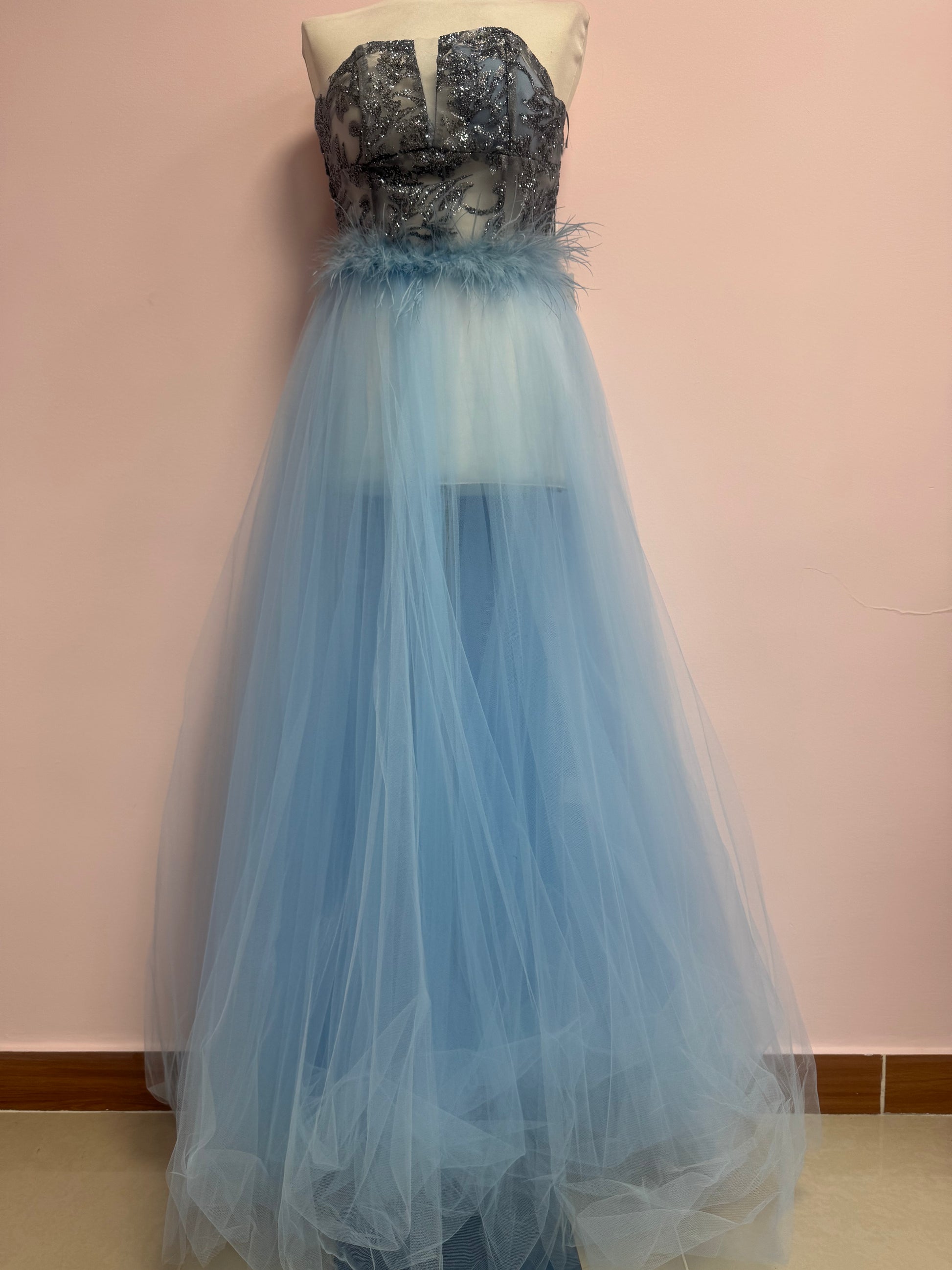 Questo elegante abito ORTEGA i810 è caratterizzato da un corpetto laminato che dona un tocco di lusso, mentre il tulle effetto nudo aggiunge sensualità. Un mix perfetto di eleganza e stile audace, ideale per ogni occasione speciale.