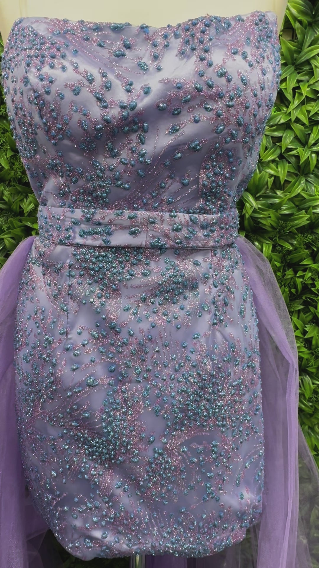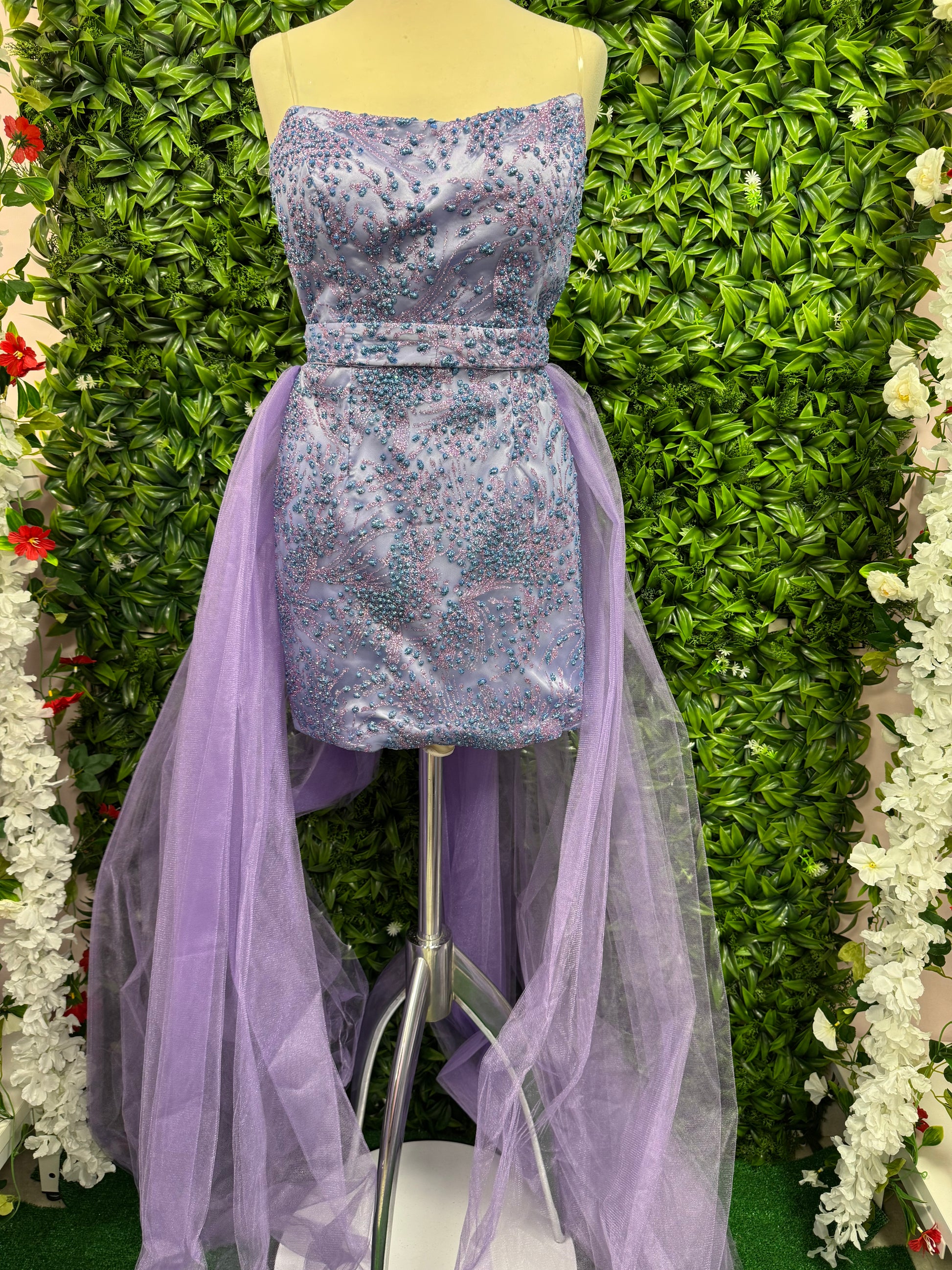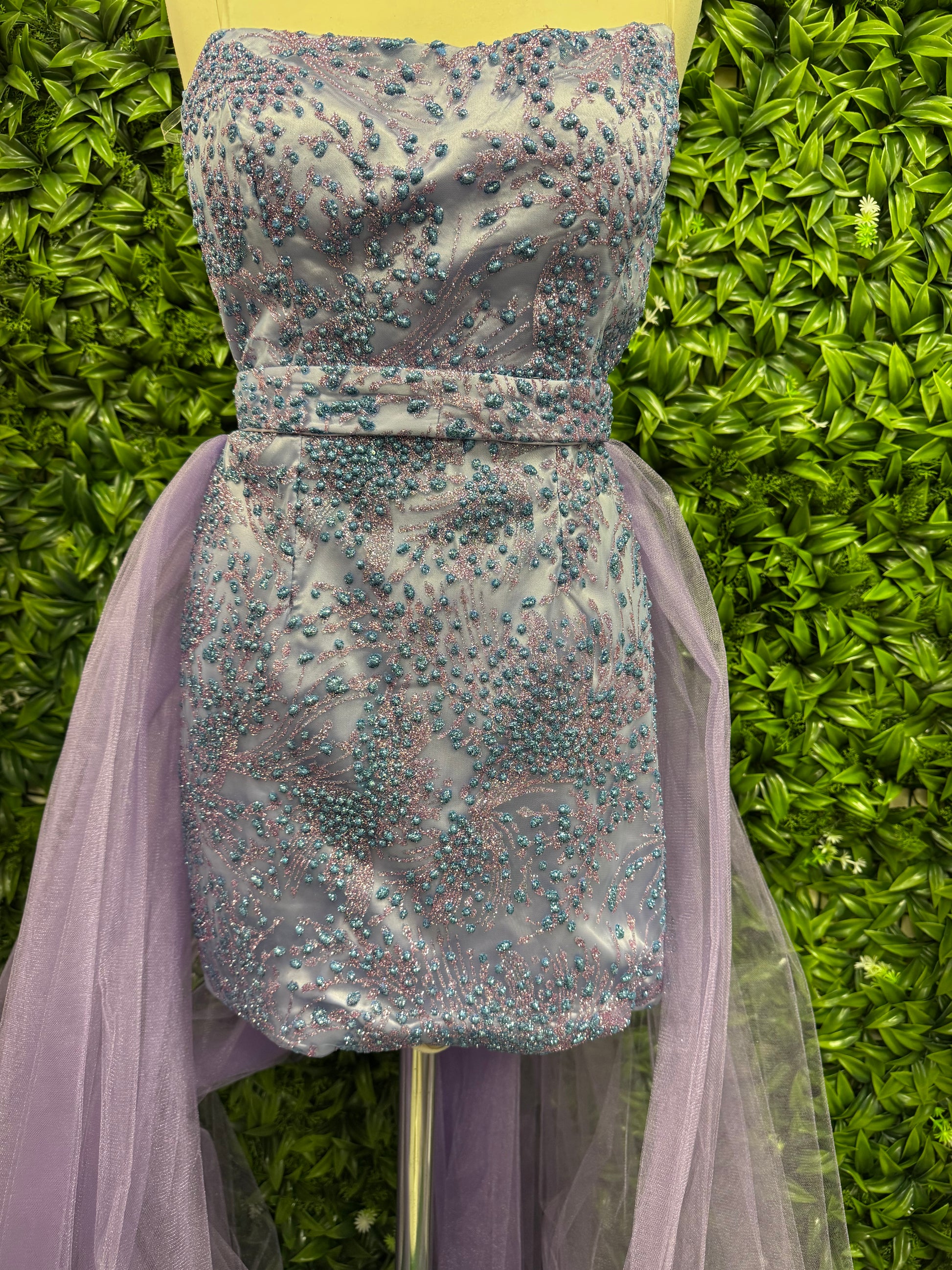 Abito Sofia tubino corto elegante caratterizzato da una raffinata coda in tulle che aggiunge movimento e leggerezza alla silhouette. Il design a tubino valorizza la figura femminile mentre il dettaglio della coda crea un effetto di contrasto sofisticato, ideale per occasioni speciali che richiedono un tocco di originalità.