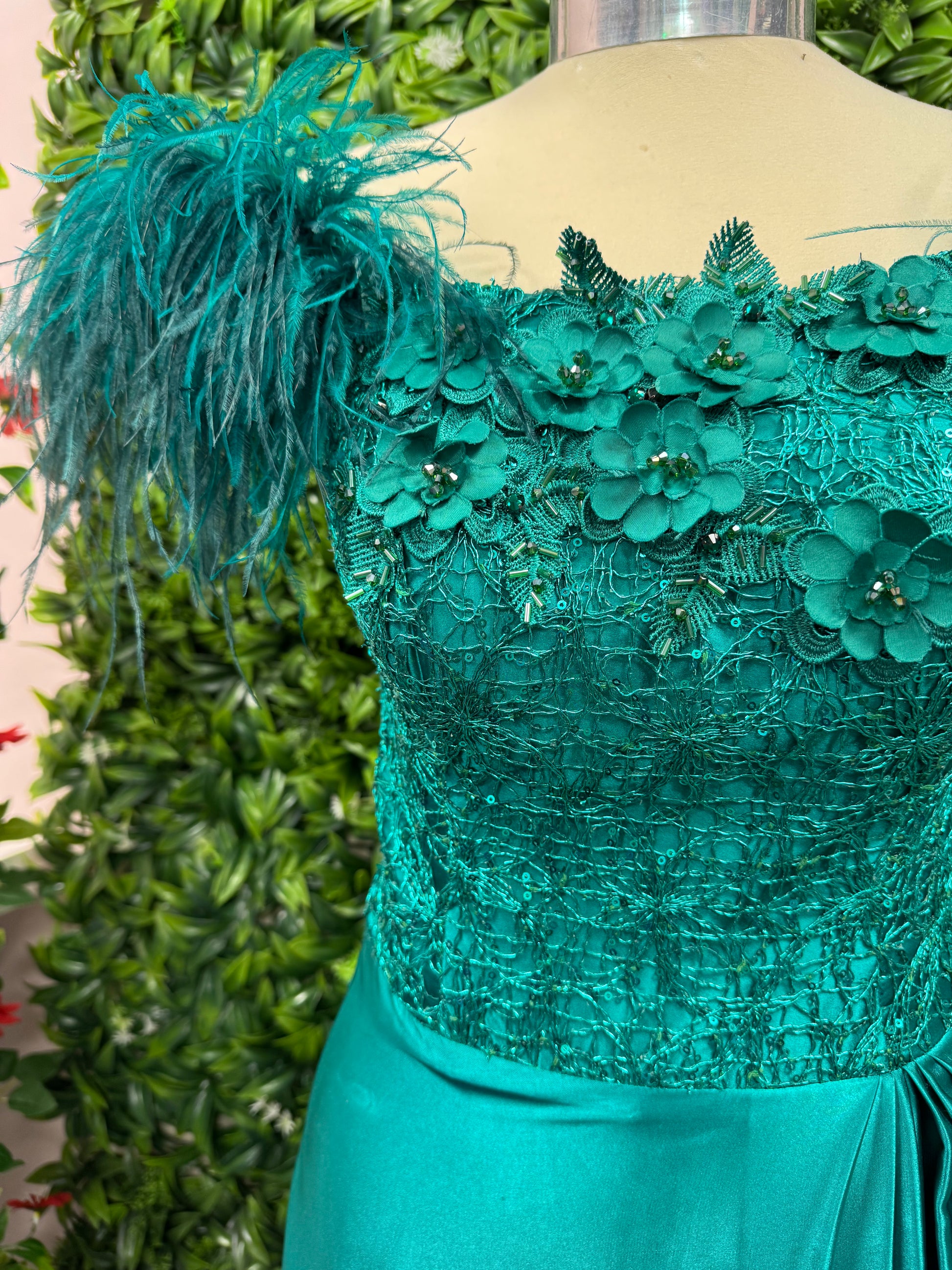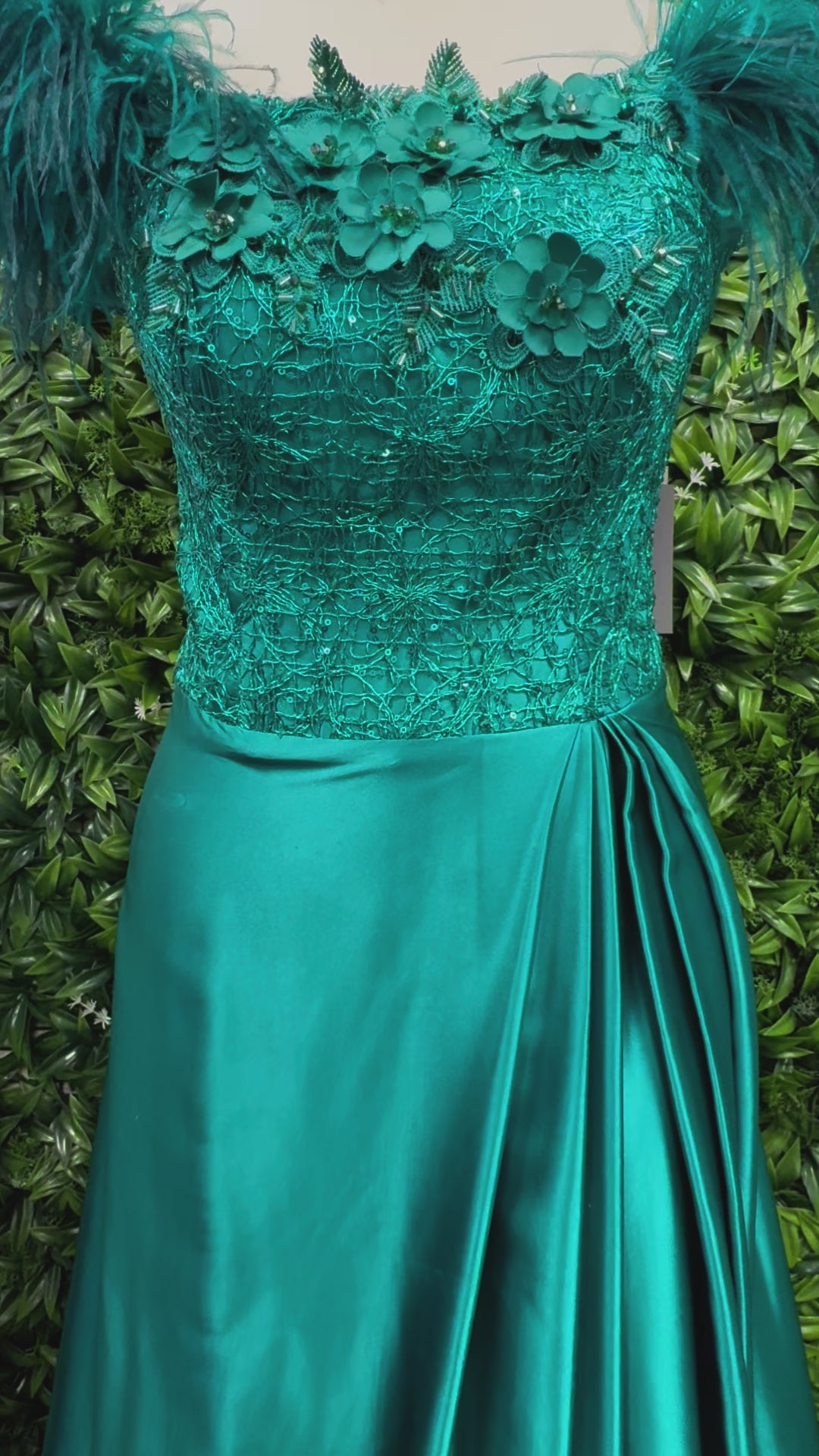 Abito Solange, un capo d'alta moda caratterizzato dall'elegante gonna in raso e dalle sofisticate piume applicate alle spalle. La combinazione di tessuti pregiati e dettagli ricercati crea un equilibrio perfetto tra raffinatezza e audacia, ideale per occasioni speciali dove si desidera distinguersi con classe ed originalità.