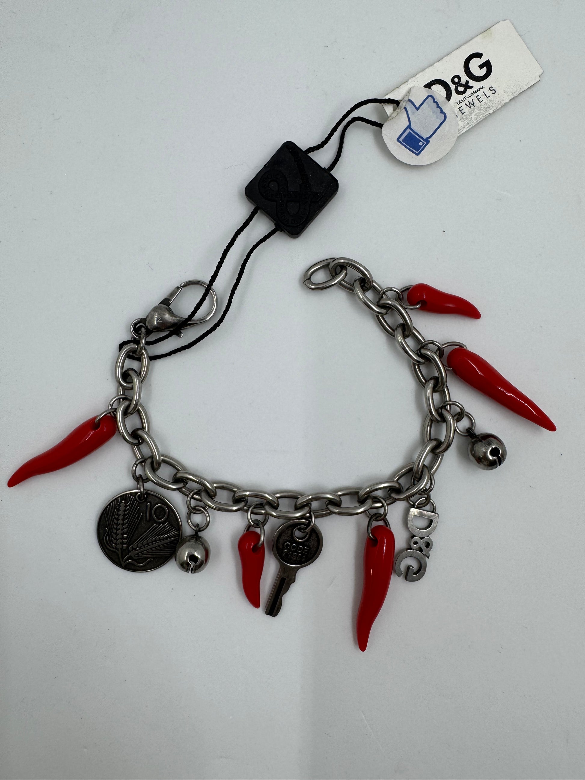 Questo bracciale D&G unisce eleganza e simbolismo con pendenti a forma di corno in plastica rossa, accompagnati da charm a forma di moneta da 10 lire e chiave. Un accessorio raffinato che richiama tradizione e stile contemporaneo, perfetto per chi cerca un dettaglio distintivo e carico di significato.