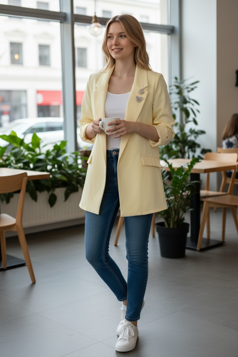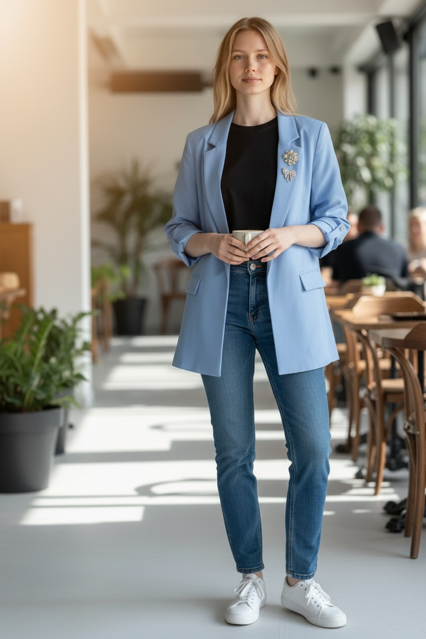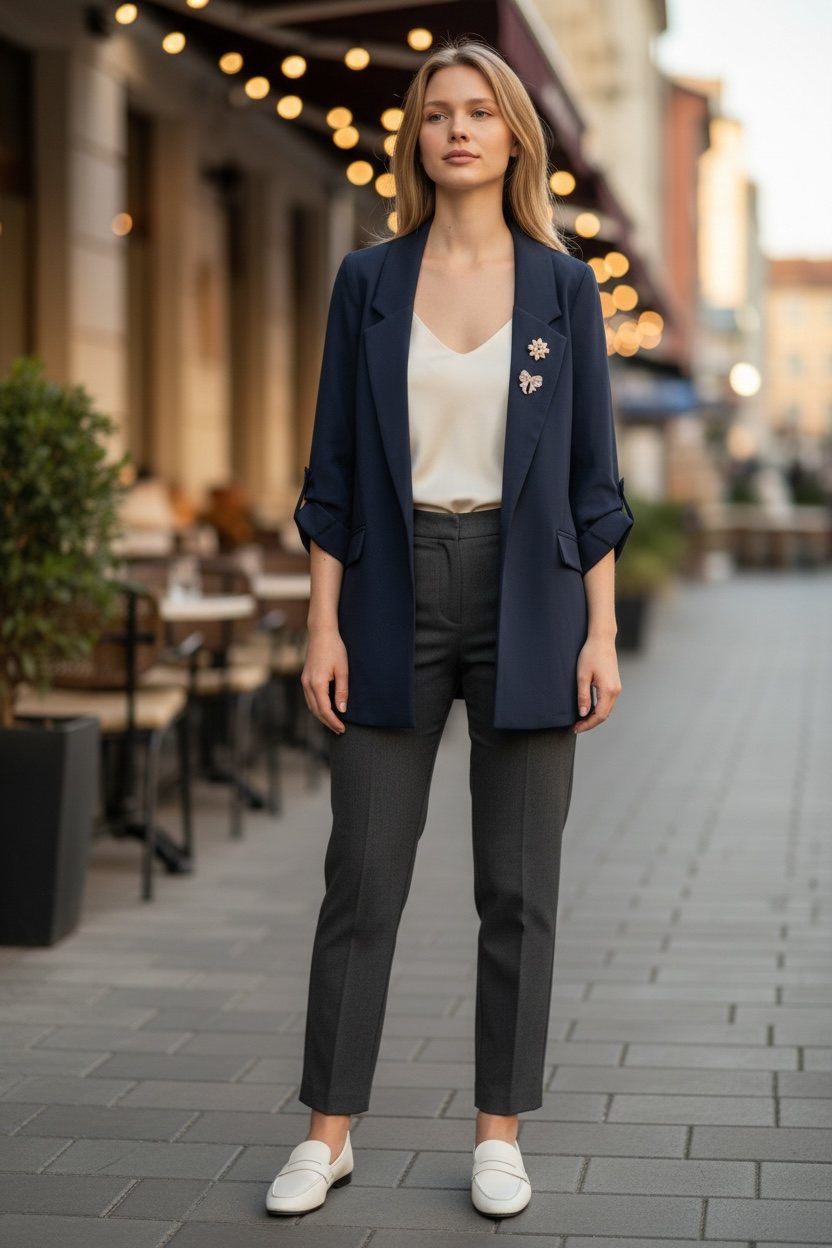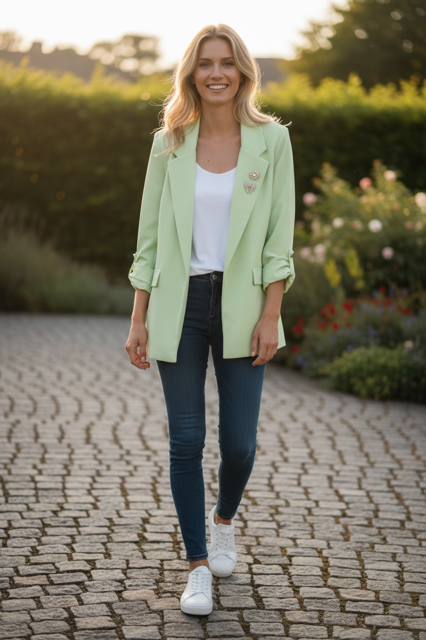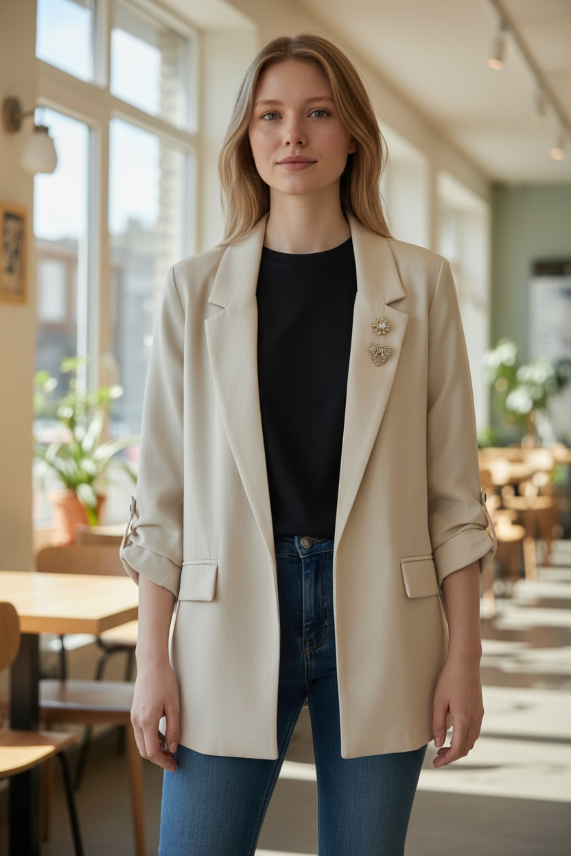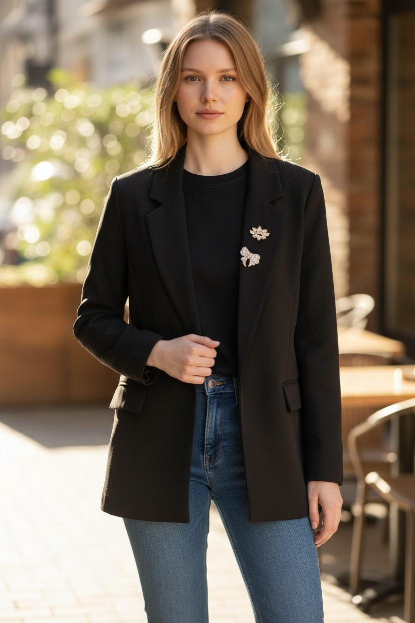 Giacca leggera, sfoderata con bottoncino alla manica per alzarla a tre quarti due spille con brillantini, Modello un po’ lunga Vestibilità dalla 42 44 fino a 48 50