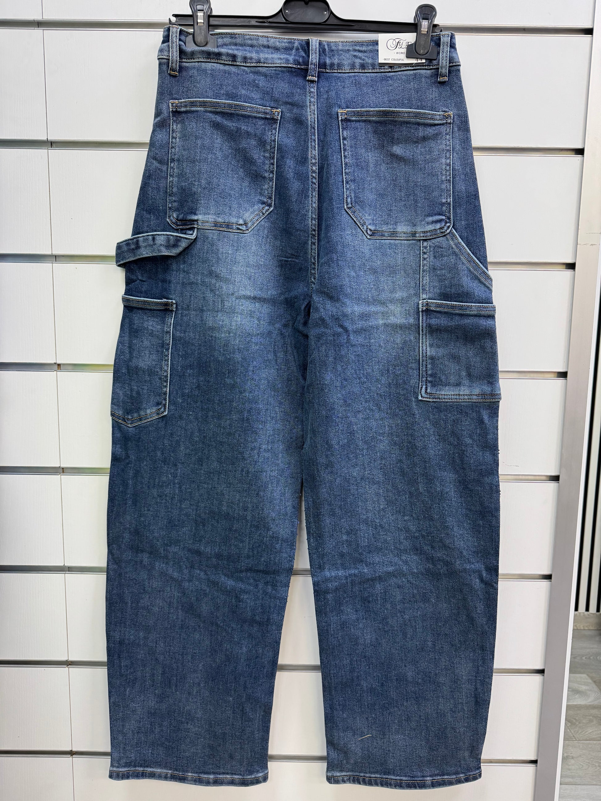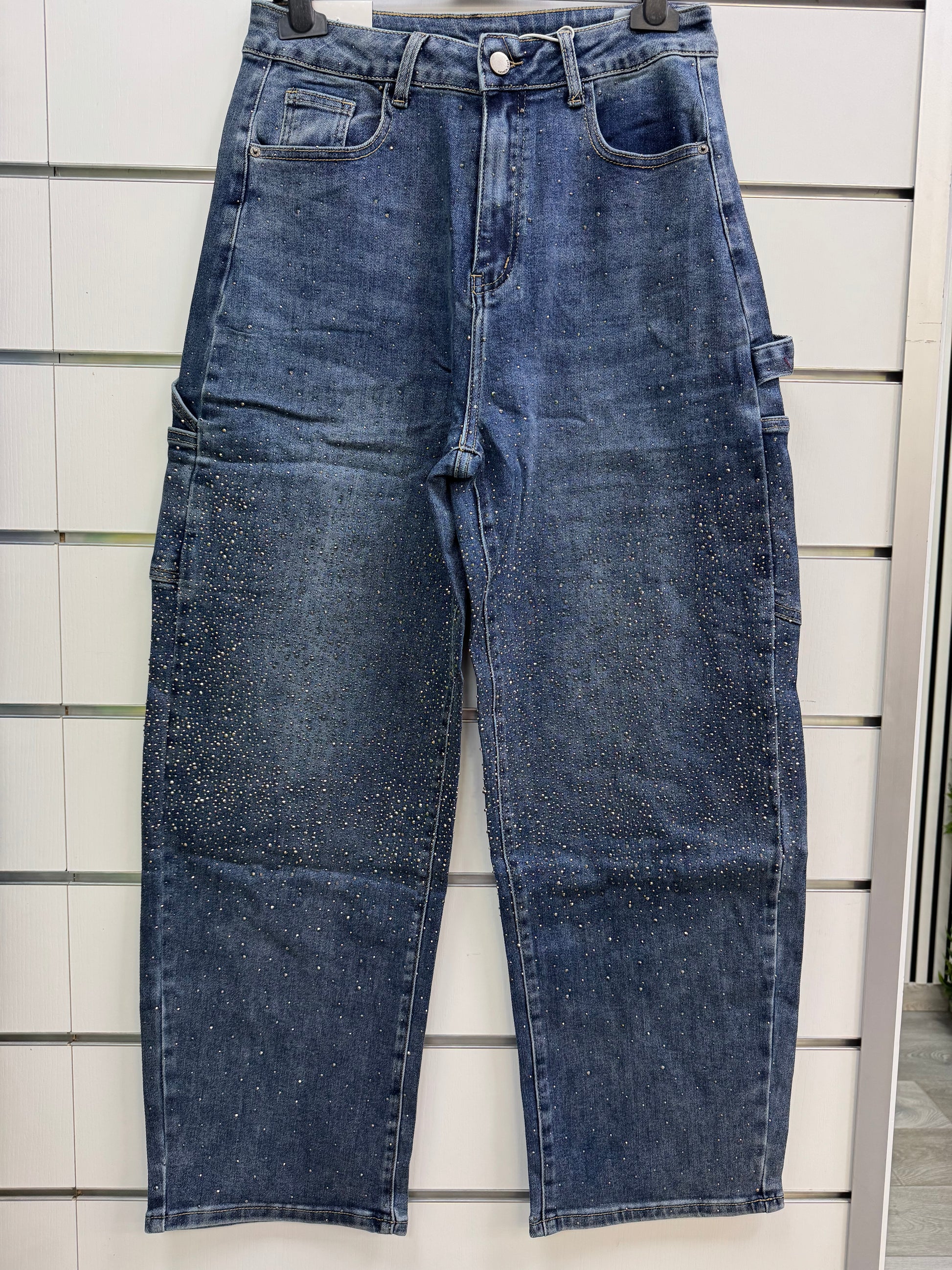 Jeans, modello balloon, vestibilità buggy, colore blu con brillantini, avanti, ma dietro, semplice