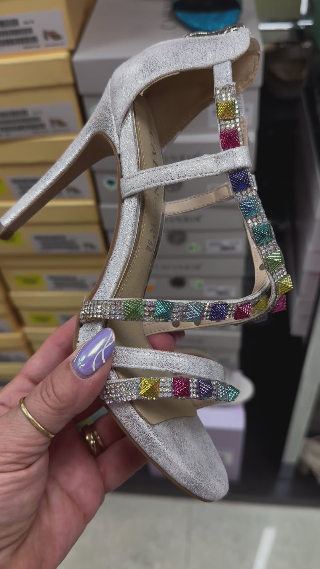 Eleganti sandali Cafè Noir in argento, impreziositi da borchiette colorate che donano un tocco distintivo. La chiusura con cerniera lampo sul tallone garantisce una calzata sicura e pratica. Il tacco alto di 10 cm slancia la figura, ideale per chi cerca stile e comfort in un unico modello. Perfetti per occasioni speciali o per aggiungere un dettaglio sofisticato al tuo look quotidiano.