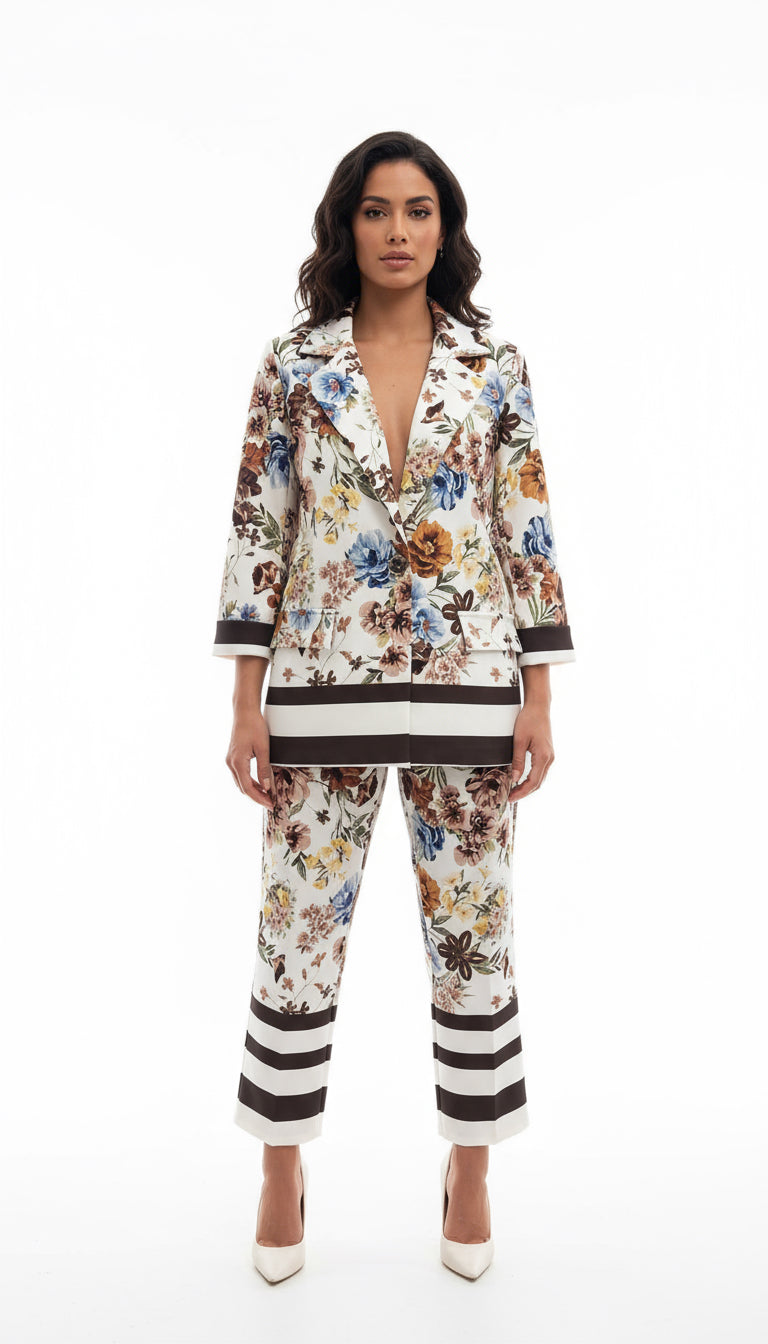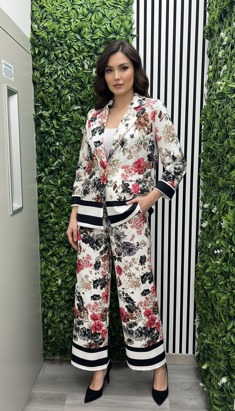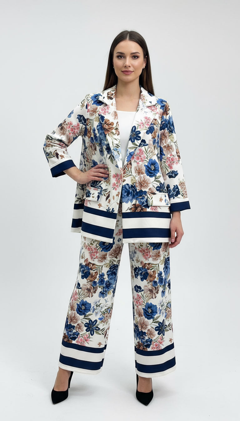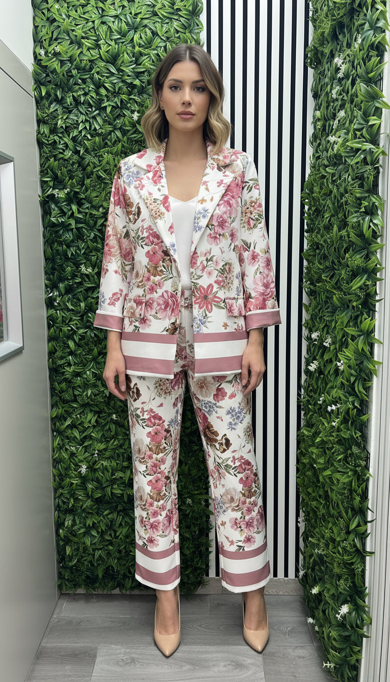 Tailleur con pantaloni gamba larga e elastico in vita, giacca con bottone. Taglia unica che veste fino ad una taglia 48